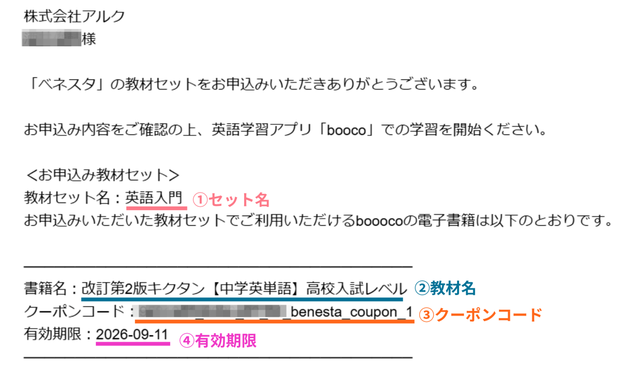 セットの申込をすると以下の画像のような件名「アルク「べネスタ」サービス利用開始(社員様向け)のご案内クーポン利用」の案内メールが届きます。