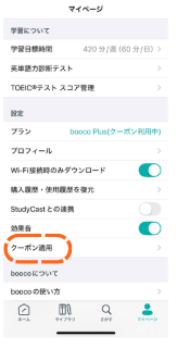 ↓マイページへ移動後、「クーポン適用」をクリックします。