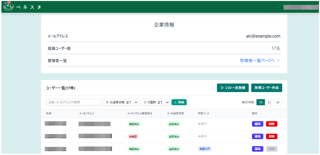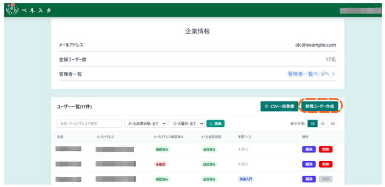 ユーザー登録は企業管理画面ダッシュボード上から行うことが可能です。直接、手入力の方法とCSVの一括登録の2通りがあります。