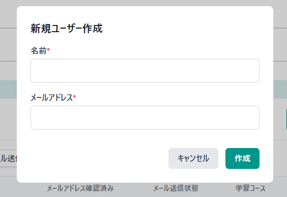 2.以下の画面が表示されますので、直接名前・メールアドレスを記入ください。記入し、作成ボタンを押すとユーザーにメール案内します。