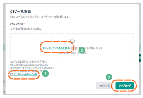 2.クリックすると以下の画面が表示されます。①テンプレート(CSVファイル)をダウンロードして、記入の上、ファイルを②にドラック&ドロップし、③アップロードをクリックします。